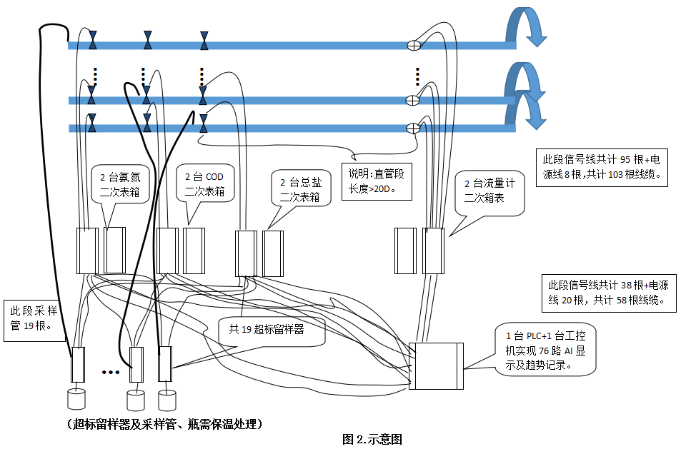六、技術(shù)要求: 1測(cè)量設(shè)備的安裝:氨氮、COD(已招標(biāo),以后不再重復(fù))、總鹽、流量計(jì)(已安裝,以后不再重復(fù))以及取水口分別科學(xué)、合理的安裝于污水管道上(如圖2.)。 2、二次表:氨氮二次表(兩個(gè)儀表箱)、COD二次表(兩個(gè)儀表箱)、總鹽二次表(兩個(gè)儀表箱)、以及流量計(jì)二次表(兩個(gè)儀表箱)分別放在相應(yīng)儀表箱內(nèi)。 3、節(jié)點(diǎn)信號(hào):氨氮二次表、COD二次表、總鹽二次表分別提供超標(biāo)的節(jié)點(diǎn)信號(hào),以及流量計(jì)二次表提供斷流的節(jié)點(diǎn)信號(hào)給留樣器。 4、留樣器(已招標(biāo),以后不再重復(fù)):設(shè)計(jì)安裝19路超標(biāo)留樣器,針對(duì)每條污水管線任何超標(biāo)現(xiàn)象,進(jìn)行采樣留存。 5、采樣要求:流量計(jì)無流量,停止采樣;氨氮、COD、總鹽的其中任何一個(gè)指標(biāo)超標(biāo),啟動(dòng)超標(biāo)留樣器進(jìn)行采樣留存。 6、工控機(jī)(PLC):實(shí)現(xiàn)集中顯示以及實(shí)現(xiàn)歷史記錄查詢,并完成月報(bào)、年報(bào)。 7、短信提醒:超標(biāo)采樣的同時(shí),發(fā)送手機(jī)提醒信息,說明是哪一路管線及何種指標(biāo)超標(biāo)采樣。 8、趨勢(shì)要求:集中實(shí)時(shí)數(shù)據(jù)顯示及歷史趨勢(shì)記錄顯示,歷史趨勢(shì)顯示方式為曲線型。 9、手機(jī)顯示:實(shí)現(xiàn)手機(jī)無線信號(hào)接收,集中實(shí)時(shí)顯示及趨勢(shì)記錄顯示。 10、房屋要求:乙方方提出房屋面積、保溫、防水等要求。 11、伴熱保溫要求:乙方完成合理的管線保溫伴熱的施工方案及材料清單。 12、乙方需安排專人進(jìn)行現(xiàn)場(chǎng)指導(dǎo)安裝。 13、詳見圖1.現(xiàn)場(chǎng)照片及圖二.初步安裝示意圖。 七、對(duì)投標(biāo)單位及投標(biāo)文件的要求: 1. 企業(yè)簡(jiǎn)介 2. 營業(yè)執(zhí)照復(fù)印件(蓋公章) 3.法人身份證復(fù)印件及或代理人身份證復(fù)印件(蓋公章) 4.代理人委托書。 5. 主要業(yè)績(jī)(三年內(nèi)同等規(guī)模)(蓋公章) 6. 一年內(nèi)銷售合同(復(fù)印件蓋公章)。 7.投標(biāo)書中需包含有投標(biāo)方對(duì)所投標(biāo)設(shè)備的檢驗(yàn)、試驗(yàn)及驗(yàn)收標(biāo)準(zhǔn)的詳細(xì)敘述。 8.投標(biāo)書中需包含有投標(biāo)方對(duì)所投標(biāo)設(shè)備的設(shè)備性能保證方案的詳細(xì)敘述。 9.投標(biāo)單位可以在甲方提供的設(shè)計(jì)數(shù)據(jù)基礎(chǔ)上,提前與甲方溝通,征得甲方技術(shù)人員同意,優(yōu)化方案,但必須滿足相關(guān)國家或行業(yè)標(biāo)準(zhǔn)、規(guī)范。 10.甲方從相關(guān)投標(biāo)方中選擇質(zhì)量有保證、價(jià)格合適、既節(jié)能又經(jīng)濟(jì)的方案與供貨方合作。 八.設(shè)備的質(zhì)保及服務(wù)內(nèi)容 九.需報(bào)出設(shè)備的制作周期及交貨方式 十、投標(biāo)截止日期:2018年 3月16日18 時(shí) 開標(biāo)時(shí)間: 2018年3 月20 日 9:30 時(shí) 開標(biāo)地點(diǎn): 綠源公司一樓會(huì)議室 十一、聯(lián)系人:尹工 17733798538 滄州綠源水處理有限公司